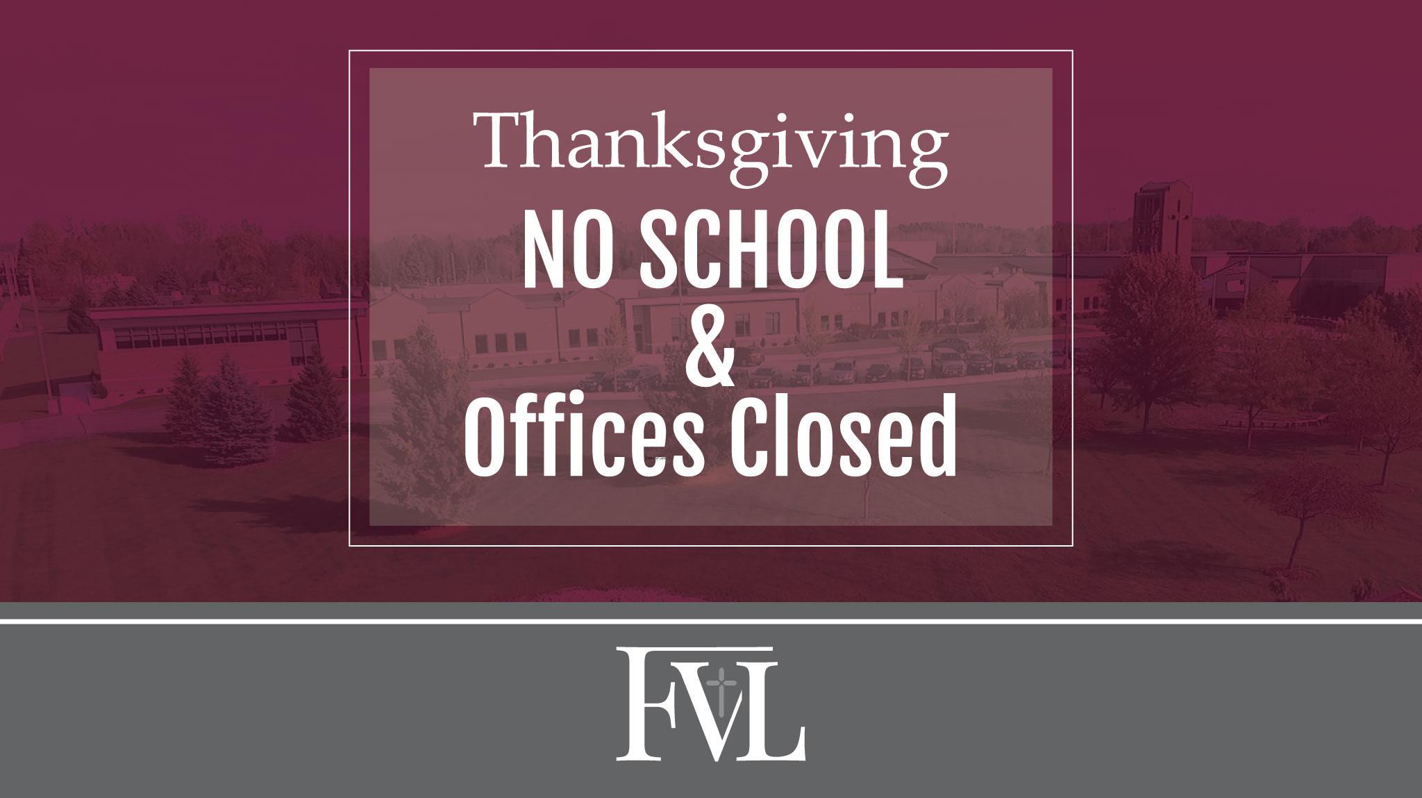 No School & Offices will be closed Wednesday, November 26 through Friday, November 28. Blessings on your Thanksgiving!